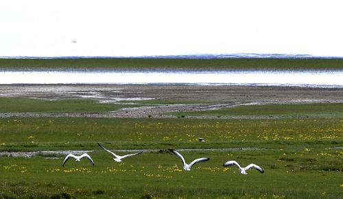 鳥兒從羊卓雍措飛過(8月16日攝)。羊卓雍措位于西藏浪卡子縣境內,與納木措、瑪旁雍措并稱西藏三大圣湖。夏季是這里一年中最美麗的季節,也是旅游旺季。新華社記者 普布扎西 攝