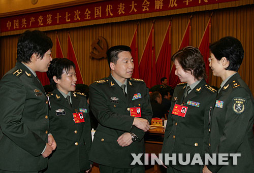 十七大期間,解放軍代表團代表楊利偉(中)與其他代表在一起。新華社記者 王建民 攝