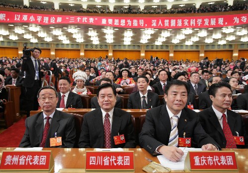 10月15日,中國共產黨第十七次全國代表大會在北京人民大會堂隆重開幕。 這是重慶市代表團、四川省代表團、貴州省代表團在大會上。新華社記者 馬占成 攝