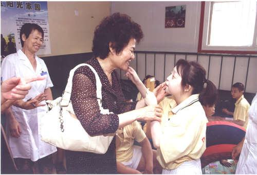 一雙稚嫩的小手,一股溫馨的暖流。雖然無法看清你的面龐,可我已經感受到你傳遞的真愛。圖為臺胞張輝林女士(泰達社區服務志愿者協會副會長)到塘沽陽光家園智障兒童福利院看望智障兒童。