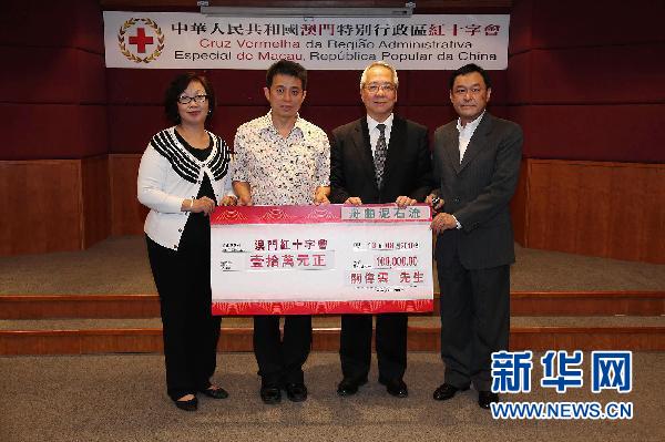 8月13日,澳門市民關偉霖向澳門紅十字會捐贈10萬澳門元,援助甘肅舟曲受災群眾。截至當日,澳門紅十字會共收到澳門社會各界向舟曲災區的捐款373.06萬澳門元。 新華社發 (張金加攝)