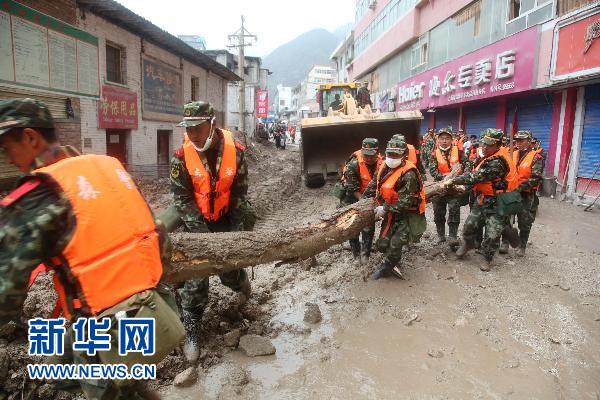8月17日,在舟曲縣城主街道,武警甘肅森林總隊(duì)官兵在水電部隊(duì)大型機(jī)械配合下開展清淤工作。新華社發(fā)(龐紅升 攝)