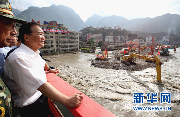 8月21日至22日,中共中央政治局常委、國務院總理溫家寶再次來到舟曲災區,看望受災群眾,慰問堅守救災一線的部隊官兵,實地指導搶險救災和恢復重建工作。這是8月22日,溫家寶在白龍江上的城江大橋察看堰塞湖治理情況。新華社記者 姚大偉攝