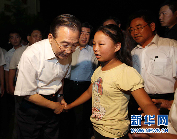 8月21日至22日,中共中央政治局常委、國務院總理溫家寶再次來到舟曲災區,看望受災群眾,慰問堅守救災一線的部隊官兵,實地指導搶險救災和恢復重建工作。這是8月21日晚,溫家寶在舟曲縣第一中學的受災群眾安置點看望受災群眾時,安慰一名小姑娘。新華社記者 劉衛兵攝