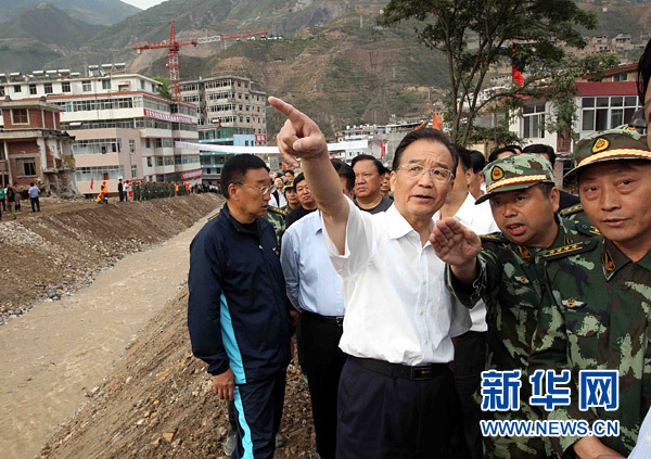 8月21日至22日,中共中央政治局常委、國務院總理溫家寶再次來到舟曲災區,看望受災群眾,慰問堅守救災一線的部隊官兵,實地指導搶險救災和恢復重建工作。這是8月22日,溫家寶來到受災嚴重的舟曲縣羅家峪,了解應急抗洪明渠搶修進展情況,研究下一步救災措施。新華社記者 劉衛兵攝
