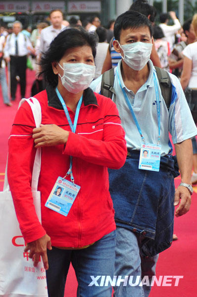 當(dāng)日,第105屆廣交會第三期展會拉開帷幕,為嚴防甲型H1N1流感,參會人員進場前一律先測體溫。新華社記者 盧漢欣 攝