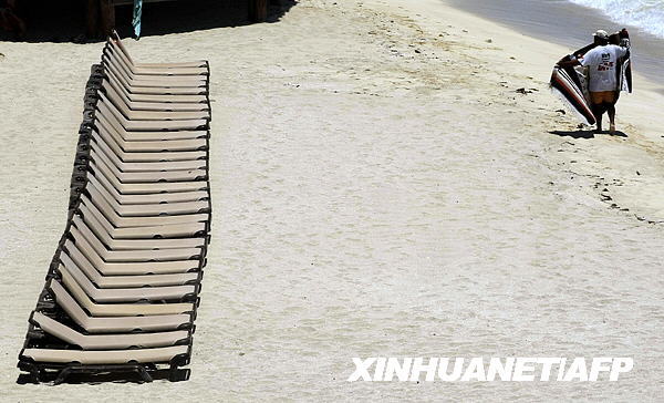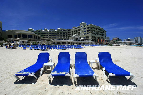5月12日拍攝的照片顯示墨西哥旅游勝地坎昆海灘上見不到一個游客。甲型H1N1流感使墨西哥旅游業遭受重創。墨西哥地方官員11日說,游客銳減已迫使旅游勝地坎昆等地的25家酒店關門。墨旅游促進委員會公布最新預測稱,2009年墨西哥旅游業盈利將比2008年減少近三成。新華社/法新