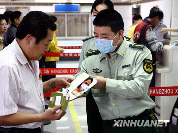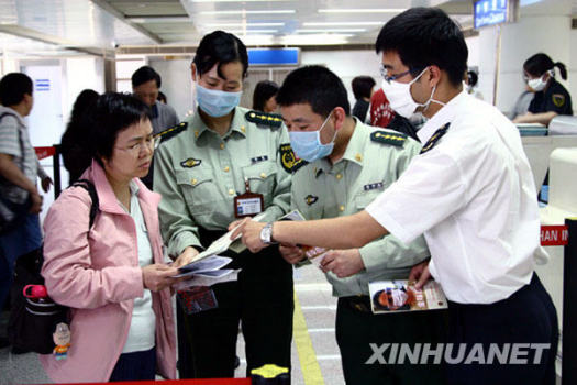 5月13日,在杭州蕭山國(guó)際機(jī)場(chǎng),工作人員向入境旅客發(fā)放甲型H1N1流感防治宣傳材料。近期,杭州邊防檢查站、檢驗(yàn)檢疫局駐機(jī)場(chǎng)辦事處聯(lián)合啟動(dòng)應(yīng)急機(jī)制,嚴(yán)防甲型H1N1流感流入。新華社發(fā)(范加龍 攝)