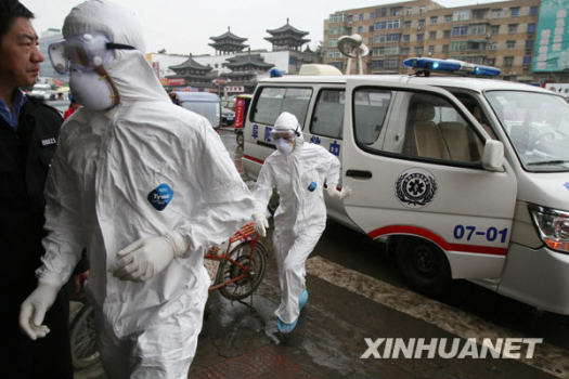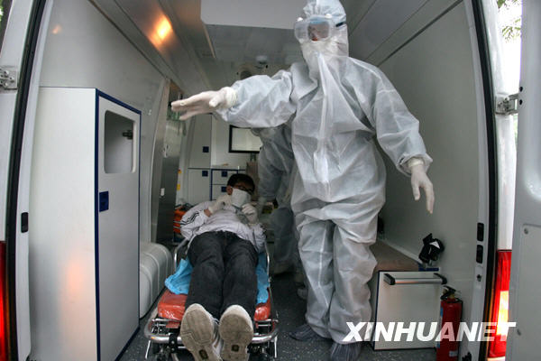 5月14日,安徽阜陽市潁州區(qū)衛(wèi)生局在該區(qū)康復醫(yī)院舉行防控甲型H1N1流感醫(yī)療救治演練,以檢驗和提高醫(yī)務人員醫(yī)療救治水平和轉(zhuǎn)送重點傳染病病人的實戰(zhàn)能力。演練內(nèi)容包括疫情收集報告、現(xiàn)場流行病學調(diào)查、病人采樣送檢、疫源地消毒等。新華社發(fā)(戴文學 攝)