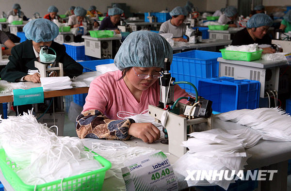 5月13日,在江蘇省泰州市海陵區(qū)九龍鎮(zhèn)一家醫(yī)用制品企業(yè),工人正在按國家統(tǒng)一標準生產(chǎn)口罩。甲型H1N1流感疫情讓口罩成為俏銷貨,泰州企業(yè)在滿負荷生產(chǎn)的同時,嚴格操作流程,按國家統(tǒng)一標準生產(chǎn),并落實質(zhì)量分級承包責任制,嚴禁劣質(zhì)口罩流入市場。新華社發(fā)(顧俊 攝)