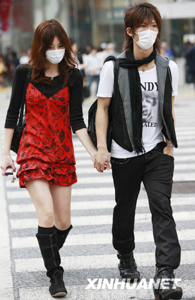 5月19日,在日本首都東京涉谷,一對情侶戴著口罩走在街頭。
