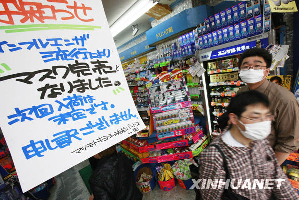 5月19日,在日本首都東京涉谷,一家藥店掛出“口罩全部售完 何時進貨未定”的告示。新華社記者任正來攝