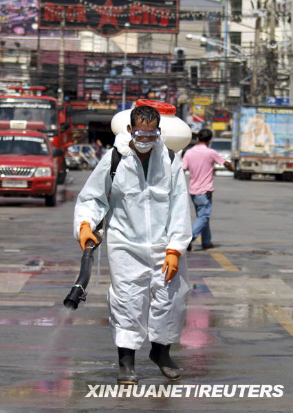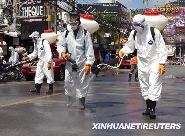 6月14日,泰國衛(wèi)生工作人員在普吉島一處海灘附近噴灑消毒藥水。泰國衛(wèi)生部當(dāng)日宣布,泰國新確診甲型H1N1流感病例44例,這使得泰國甲型H1N1流感確診病例增至150例。新華社/路透