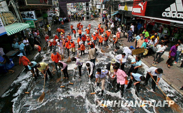 6月15日,工作人員在泰國帕塔亞清潔一條街道,以防范甲型H1N1流感疫情。截至北京時間6月15日14時,世界衛生組織共確認泰國甲型H1N1流感確診病例8例。新華社/法新