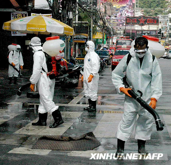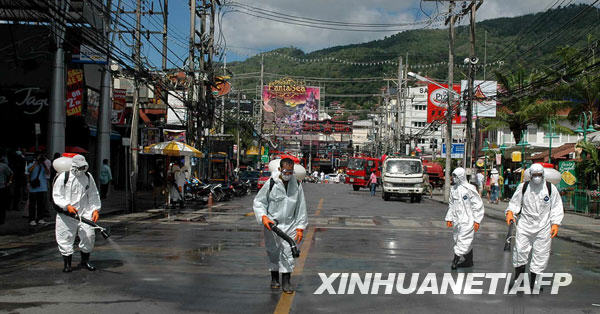 6月14日,工作人員在泰國普吉島的一條街道上噴灑消毒劑,以防范甲型H1N1流感疫情。截至北京時間6月15日14時,世界衛生組織共確認泰國甲型H1N1流感確診病例8例。新華社/法新