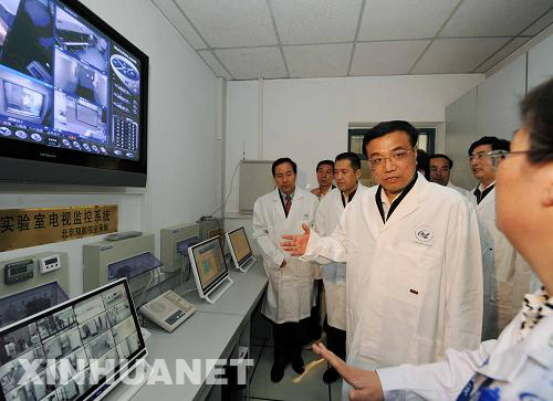 4月29日,中共中央政治局常委、國務院副總理李克強 在北京首都國際機場、中國疾病預防控制中心考察人感染豬流感防控工作。這是李克強考察中國疾病預防控制中心實驗室。新華社記者饒愛民攝