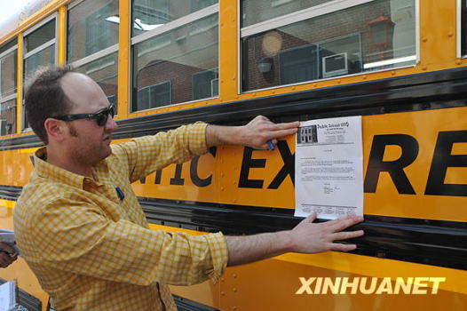 4月28日,美國紐約皇后區(qū)177公立學(xué)校的員工在校車旁展示學(xué)校關(guān)閉通知。