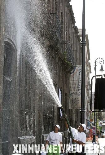 5月5日,在墨西哥首都墨西哥城,工作人員清洗建筑物外墻。世界衛生組織當日公布的最新數字顯示,全球確診的甲型H1N1流感病例已增至1490例,其中墨西哥822例。 新華社/路透