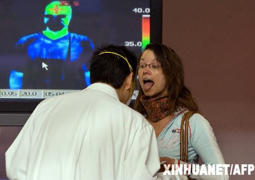 2009年5月5日 墨西哥已確診甲型H1N1流感患者人數增至776人 5月4日,在墨西哥首都墨西哥城的貝尼托華雷斯國際機場,一名墨西哥乘客接受健康檢查。墨西哥政府當日晚宣布,墨全國已確診甲型H1N1流感患者人數776人,死亡26人。新華社/法新