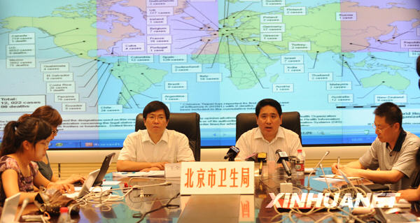 5月24日,北京市疾控中心主任鄧瑛(右二)、北京市疾控中心傳染病地方病控制所所長王全意(右三)在新聞發布會上介紹情況。當日21時,北京市衛生局通報,北京市報告一例甲型H1N1流感疑似病例,如果被確診,這將是北京市出現的第5位確診患者。