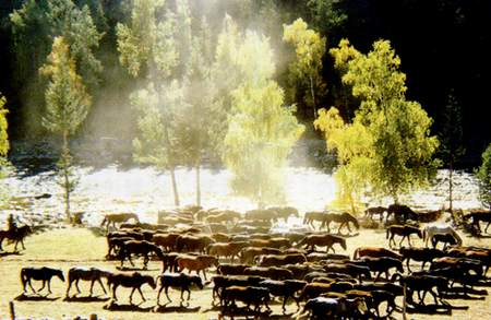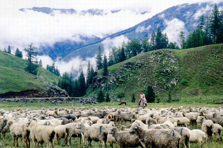 新疆的畜牧業歷史悠久。許多牧畜品種名冠全國。以馬為例,新疆自古就有著名的“天馬”和“西極馬”,經過長時間的品種改良,現在的名馬更多,伊犁馬、哈薩克馬、焉耆馬、巴里坤馬等都各有特色;作為新疆家畜種群中最繁盛的羊,品種更是豐富,新疆細毛羊的新疆型和新疆軍墾型,所產羊毛優質高檔;和田 半粗毛羊所產羊毛適合編制地毯、掛毯;羔皮用羊有庫車卡拉庫爾羔皮羊和策勒黑羊;主要提供肉食的有和田羊、阿勒泰大尾羊、巴音布魯克大尾羊、塔什庫爾干大尾羊等。在新疆,牛的名氣雖比馬遠為遜色,但飼養量卻是馬的三倍以上,地方品種有哈薩克牛、蒙古牛等,而由哈薩克和瑞士褐牛、阿拉托烏牛、柯斯特羅姆牛雜交育成的乳肉兼用的新疆褐牛,也是享譽海內外的優良品種。新疆的優良農畜品種還有新疆雙峰駝、新疆白豬、新疆黑豬、良種絨山羊等;塔里木馬鹿和天山馬鹿通過長期培育馴養,也加入了家畜品種不多,但特色卻很鮮明,如產自伊犁和塔城的會飛的新疆鵝、吐魯番的大骨斗雞、新和縣的食用家鴿等。