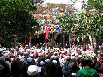 圣紀節,阿拉伯語稱“冒路德節”,在每年六月八日進行。相傳這天為穆罕默德的逝世日,亦稱“圣忌”。為緬懷其功德,舉行紀念活動,主要包括誦經、贊圣和講述其生平事跡。當日穆斯林前往清真寺聽教長、阿訇講經,然后游玩一天,有的還宰殺牛羊,設宴聚餐。