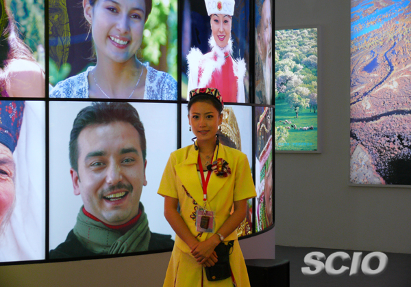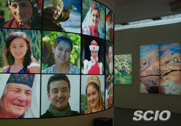 走進(jìn)展廳,一幅幅新疆美景映入眼簾。靜美的喀納斯湖、星羅棋布的山川河流……這些圖片構(gòu)成了展廳中一條美麗的長(zhǎng)廊。長(zhǎng)廊一側(cè)的大型照片布滿了世居新疆的13個(gè)民族各具特色的臉龐,燦爛的笑容洋溢在自治區(qū)各族同胞的臉上,給人無(wú)限的感動(dòng)。維吾爾族、哈薩克族、達(dá)斡爾族、俄羅斯族、蒙古族、漢族……各族人民團(tuán)結(jié)一心,歡欣鼓舞。這些獨(dú)具匠心的設(shè)計(jì),讓參觀者流連忘返。
