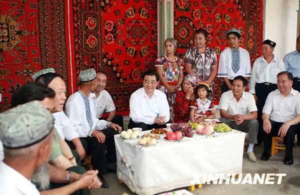 8月22日至25日,中共中央總書記、國家主席、中央軍委主席胡錦濤在新疆考察工作,深入天山南北看望慰問各族干部群眾。這是胡錦濤在阿克蘇市良種場尤喀克橋格塔勒村村民亞森·吐尼亞孜家院子里,同維吾爾族、漢族鄉(xiāng)親親切交談,勉勵大家共同建設(shè)團結(jié)和諧的美好家園。新華社記者鞠鵬攝