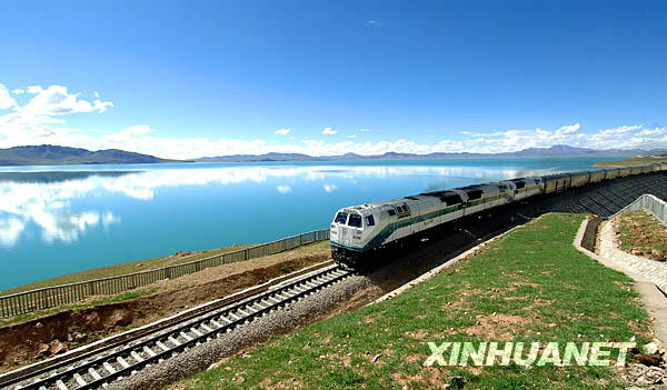 2006年7月20日,一列火車駛過藏北錯那湖邊。2006年7月1日,全程1142公里的青藏鐵路開通(資料照片)。