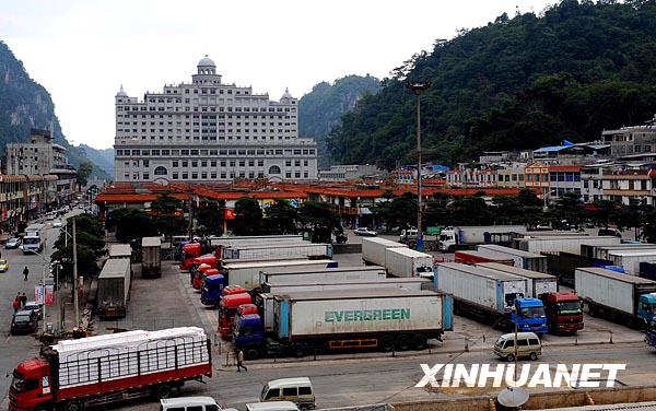 2008年11月19日,來自中國各地和越南的大型貨車在廣西憑祥口岸浦寨貿易區等待交易(資料照片)。