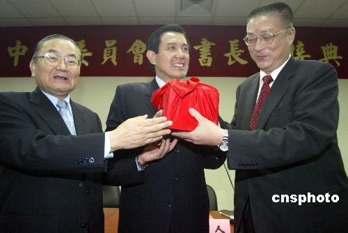一月十二日上午,中國國民黨中央委員會舉行秘書長交接儀式,原任秘書長詹春柏(左)在國民黨主席馬英九的監督下,將印信交給新任秘書長吳敦義(右)。 中新社發 張煒 攝
