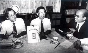 1989年10月5日,“美麗島事件”十余位辯護律師陳水扁(左)、謝長廷(中)、蘇貞昌(右)等重聚,商討如何救援許信良。