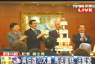 馬英九特別送了一個五層的大蛋糕,還贈送帶有其親筆所寫“唯仁者壽”字樣的法藍瓷花瓶,以及壽酒做為生日禮物。