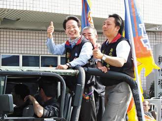 國(guó)民黨大臺(tái)南市長(zhǎng)候選人郭添財(cái)(左)昨天以車隊(duì)掃街,對(duì)自己的選情充滿信心。