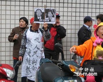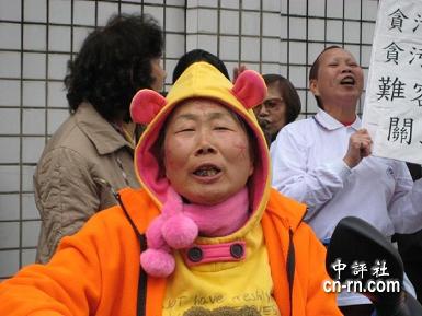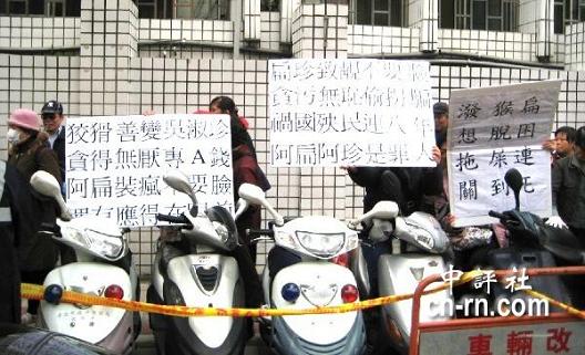 據中評社報道,臺北地方法院今天起一連三天開庭審理扁家弊案,被告吳淑珍下午坐著輪椅出庭。法院外嗆扁群眾雖然只有10余人,但都有備而來,有人穿豬頭裝、有人自制白色圍兜、拿扁珍照片,還有人高舉大字報嗆扁珍,十分投入。