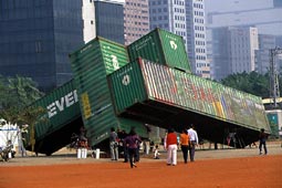 高雄港為世界第四大貨柜港,沿著港區海岸線,各種貨柜儲存處理廠中的貨柜堆棧如山,數萬噸的貨輪以吊桿將貨柜吊得比天還高,然而沒想到,原是國際海港城市里的經濟命脈——貨柜,竟也能成為藝術家創作表演的道具。