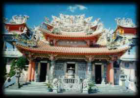 前殿部分已接近完工,屋頂采假四垂形式,其上以剪黏、磁磚、泥塑裝飾得金碧輝煌,而前殿內(nèi)外也盡其所能的加以裝飾,石雕、木雕、(水)泥塑、彩繪、龍柱、對聯(lián)等,是臺灣近代寺廟建筑的典型,也就是以鋼筋水泥為骨架,外表裝飾形式沿襲傳統(tǒng)建筑,并力求華麗繁復(fù)。