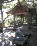 望月亭高踞獅頭山巔,海拔496公尺,正是新竹、苗栗兩縣的交界點(diǎn);氣喘吁吁的朝山客總聚在此歇腳,四周為高大濃密的相思樹(shù)林,清風(fēng)徐來(lái),拂去一身疲憊;開(kāi)闊處可以下望南莊、中港溪一帶的河谷山巒。望月亭之后,步道便邁向獅尾肅穆幽靜的禪修圣地,與獅頭富麗堂皇的殿宇風(fēng)光迥異,予人寧心靜氣的平和感。
