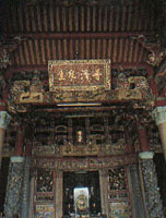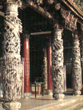 輔天宮為登獅頭山的第一站,與勸化堂上下相連,兩寺層層疊疊的燕尾屋脊,營(yíng)造出堂皇莊嚴(yán)的氣勢(shì),尤其屋脊上布滿(mǎn)琉璃剪粘,更顯富麗;站在宮前平臺(tái)極目四望,中港溪從象山腳下迤邐淌過(guò),風(fēng)光無(wú)限。輔天宮創(chuàng)于1915年,奉祀地藏王菩薩、閻羅王,為三大圣剎中的地府,森羅殿兩壁并刻有十八層地獄圖,警世意味濃厚。其山門(mén)名曰“柴陽(yáng)門(mén)”,為仿古城樓,已有80余年歷史,精致樸雅的石雕,散發(fā)出歲月的滄桑。