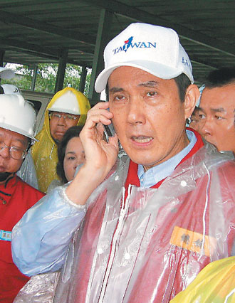 馬英九昨到嘉義縣民雄鄉(xiāng)勘災(zāi),拿手機(jī)打給臺(tái)北市消防局征調(diào)橡皮艇支持。圖片來(lái)源:臺(tái)灣《聯(lián)合報(bào)》