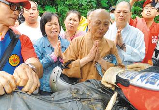 信眾見到寺廟的師父遺體被尋獲,雙手合十,送她最后一程。圖片來源:臺灣《聯合報》