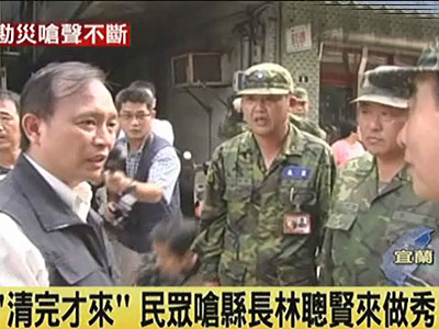 據(jù)報道,24日,天氣短暫放晴,民進黨籍宜蘭縣長林聰賢開始巡視淹水災(zāi)區(qū),卻出現(xiàn)不尋常的現(xiàn)象,幾乎走到哪就被罵到哪。一名大叔說,都淹了好幾天了,還是靠著臺北的女兒上網(wǎng)把淹水的情況公布了大家才知道,而縣長這個時候才到。也有老婦人說,淹水的時候看不到縣政府的人員前來,還不是靠著自己的力量清理家園,都快清得差不多了,縣長才出現(xiàn)。