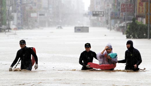 臺灣宜蘭21日雨量驚人,蘇澳鎮淹水嚴重,救護人員進入救援。來源:臺灣《聯合報》