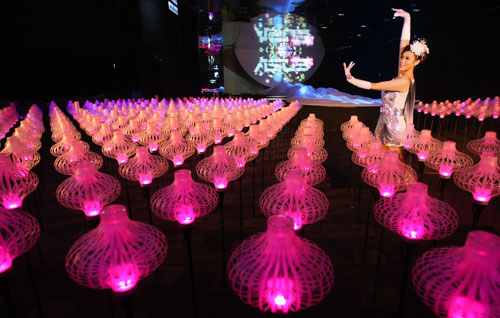 臺北花博新生公園夢想館12日舉行記者會,展演電子花朵為主題的“花械花開”,機械花朵隨著音樂、燈光開合,展現臺灣高科技成就。圖片來源:“中央社”