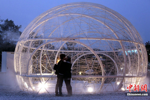 臺北花博會8日迎來第一個平日,但由于天氣轉好,入園客流依然可觀。直到入夜時分,花博園內依然人流滾滾。光影花影人影樹影,構成一道道賞心悅目的美麗夜景。圖為西班牙園藝家設計的蠶繭意境作品前,一對情侶激情擁吻。中新社記者 王健 攝