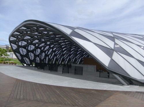 這陣子行經美術公園區的市民,無不被園區內的大型蝶蛹吸引--它是舞蝶館,是臺北花博會舉行開、閉幕的場館,也是展期中大型國際文化藝術活動的表演場所;和舞蝶館整體規劃的風味館是花博官方紀念品旗艦店,這兩座由金光裕建筑師事務所負責設計的展館,亦強調環保永續,依據節能減碳概念,打造視野寬闊、自然通風、采光良好的空間。