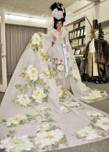 2010全球生態(tài)旅游小姐決賽24日在南京舉行,數(shù)十名佳麗參賽,臺灣實踐大學服裝設計系學生林育如,身著一襲以臺北花博萬華區(qū)區(qū)花白牡丹為意象設計的服裝參賽,驚艷全場,拿下最佳生態(tài)旅游小姐獎,林育如26日載譽返臺,在高雄家鄉(xiāng)展示參賽服裝。