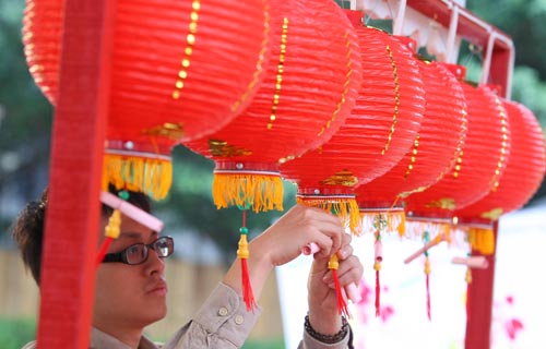 元宵節將至,臺北花博新生園區的花夢廣場10日舉行猜燈謎活動,答對的人可獲得花博小禮物。一名工作人員將謎題綁在燈籠上。圖片來源:臺灣“中央社”