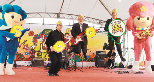 臺北市副市長邱文祥(中)、北市府參議陳慶安(右)及花博總制作人丁錫鏞(左)裝扮成搖滾樂手,慶;ú┩黄屏偃f入園人次。圖片來源:臺灣聯(lián)合報(bào) 侯永全 攝