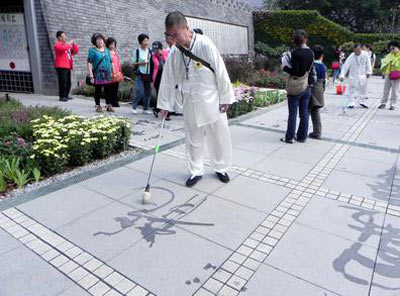 臺北花博會,陜西西安6位民眾組成“輕描淡寫”書寫團,正在西安展園用地書筆蘸清水,在地面進行書法書寫,除了低碳又環保,還能鍛煉身體。圖片來源:“中央社”